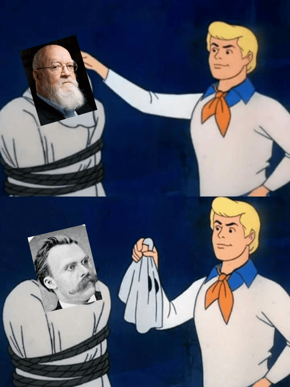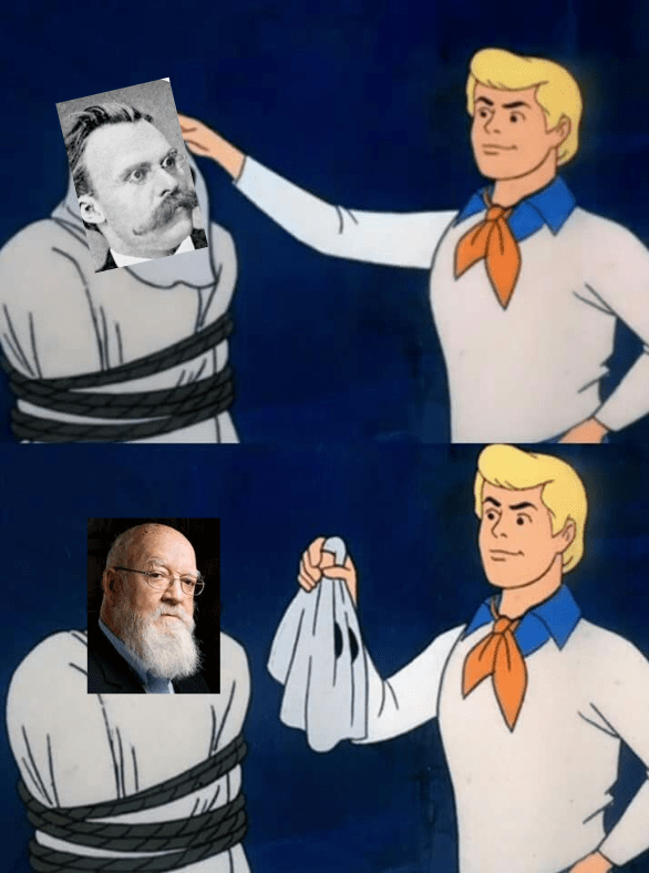 Ovdje je paralela s Nietzscheom iznimno snažna, jer i Nietzsche i Dennett vide nužnost prevrjednovanja svih vrijednosti. Kod Nietzschea to je egzistencijalni i kulturni projekt, a kod Dennetta znanstveno-filozofski. No struktura je ista: prvo se rastvara postojeći poredak, zatim se izgrađuje novi. Dennettov se projekt može opisati kao oblik metodološkog nihilizma koji kaže da sve postojeće teorije, pojmove i vrijednosti treba staviti pod radikalnu sumnju i rekonstruirati ih iz perspektive evolucije. Nema privilegiranih pojmova jer niti jedan od njih nije izuzet iz evolucijske, znanstvene analize. Sve mora biti objašnjeno odozdo prema gore. Znanstveno utemeljeno. Slično Nietzscheovu filozofiranju čekićem, Dennett koristi evoluciju kao analitički alat kojim testira otpornost naših intuitivnih i metafizičkih uvjerenja. Ono što ne preživi susret s darvinističkom logikom, mora biti odbačeno. Ovdje se jasno očituje radikalna kritička snaga Dennettove pozicije, ali i njezin potencijalno problematični karakter jer svijet se reducira na puku materijalnost i iluzornu pojavnost ne-materijalnih fenomena. Pa ipak, i unatoč snažnom paralelizmu, postoji i važna razlika između Dennetta i Nietzschea. Nietzscheov nihilizam nosi snažnu egzistencijalnu dimenziju jer duboko proživljava krizu smisla, tjeskobu praznine i tragičnost ljudskog položaja nakon smrti Boga. Dennett, naprotiv, ostaje izrazito optimističan. Za njega evolucijska slika svijeta nije tragedija, nego oslobođenje. Ona omogućuje racionalno razumijevanje stvarnosti i otvara prostor za znanstveno utemeljeni humanizam. Dok Nietzsche upozorava na opasnost pasivnog nihilizma, u kojem dolazi do gubitka volje, Dennett vidi darvinizam kao temelj novog optimizma. No upravo tu nastaje filozofski problem koji se pita može li svijet lišen intrinzične vrijednosti doista pružiti stabilan temelj normativnosti? Nije li Dennettova nova konstrukcija vrijednosti samo sofisticirani oblik funkcionalnog relativizma? Vječno vraćanje istoga, nakon što se staro odbaci u potpunosti?